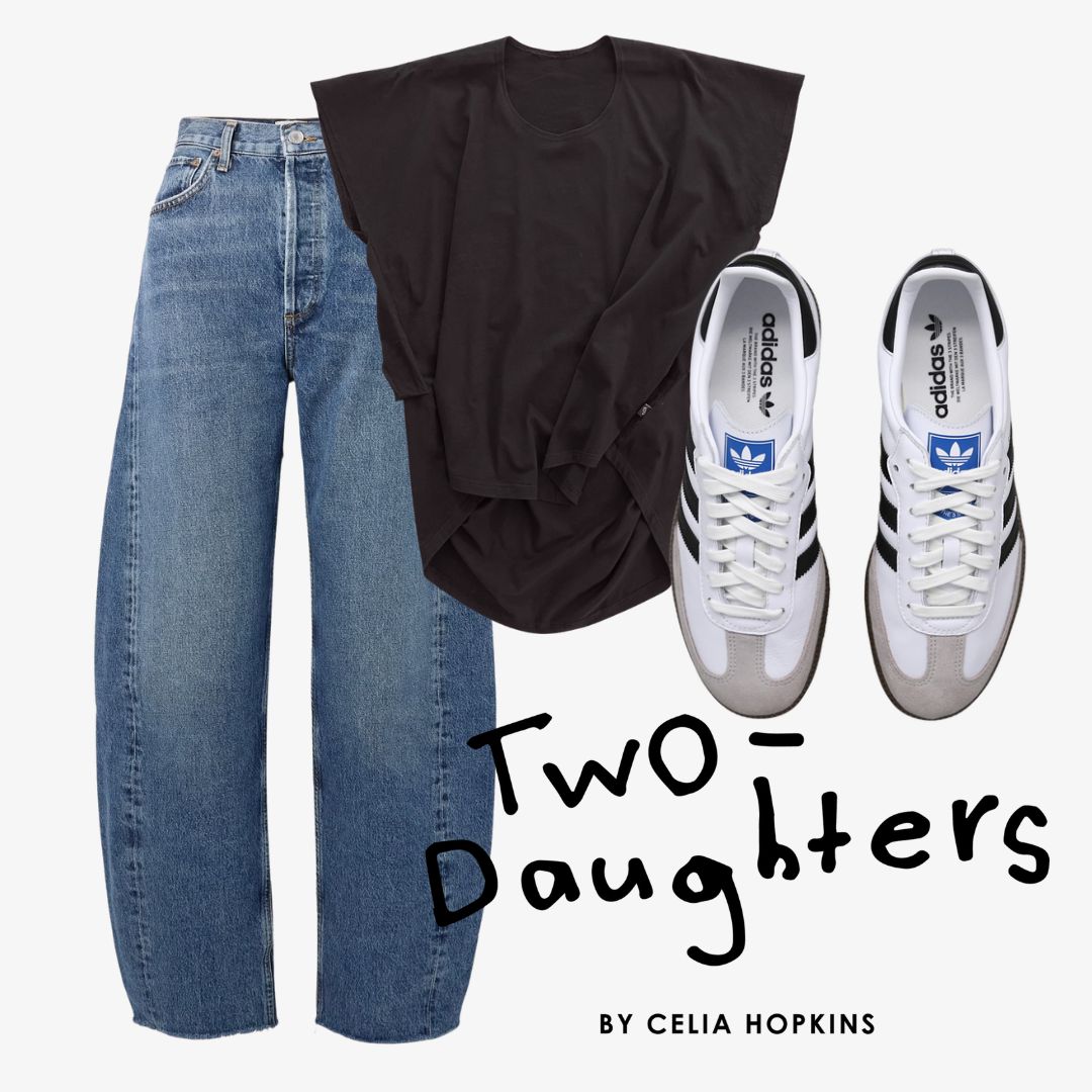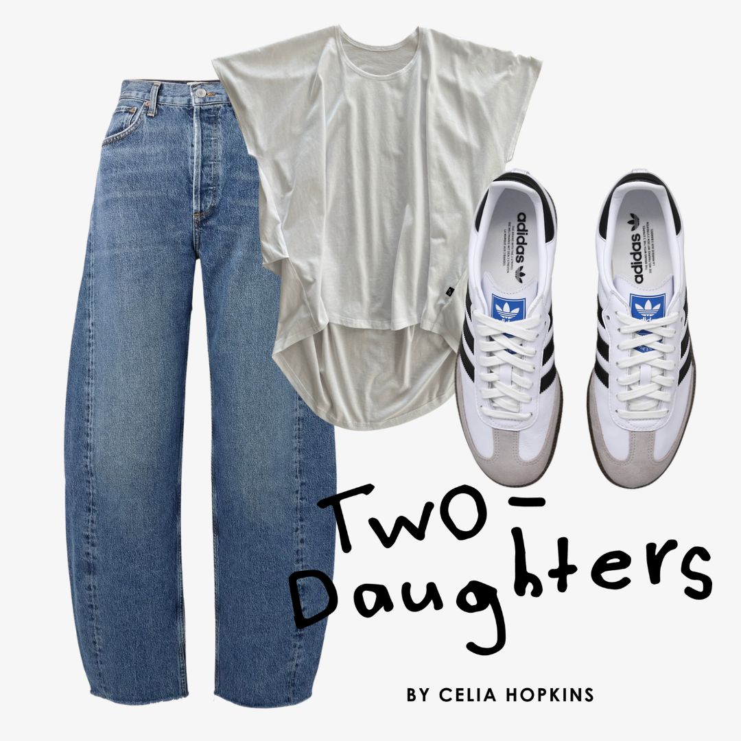 TWO DAUGHTERS High-Low Tee + Barrel Jeans + Adidas Sambas.